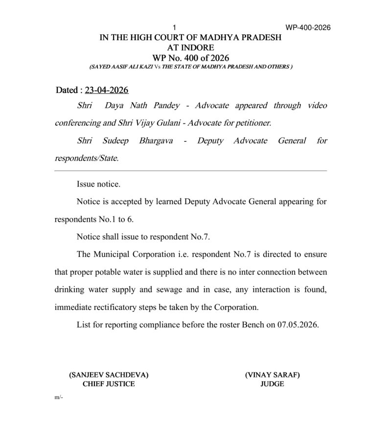 हाईकोर्ट सख्त: पीने के पानी में सीवेज मिलने की शिकायतों पर निगम को चेतावनी, 7 मई तक मांगी रिपोर्ट