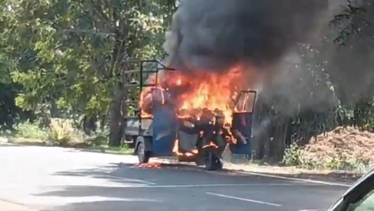 "सड़क पर आग का गोला बना लोडिंग ऑटो; बाल-बाल बचे चालक और साथी, देखें वीडियो।"