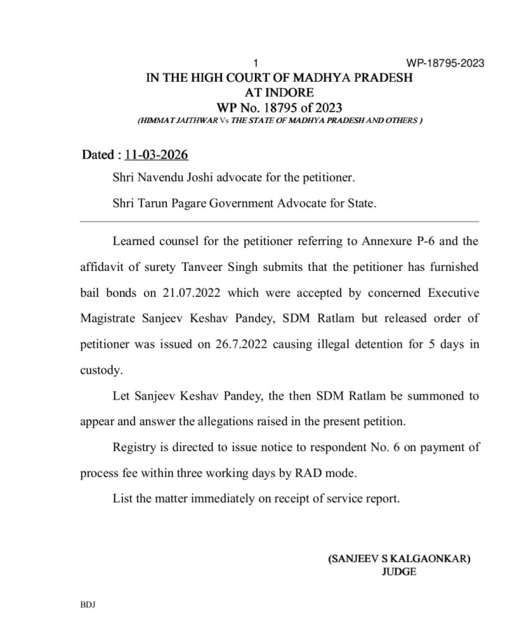 रतलाम: तत्कालीन SDM और वर्तमान ADM संजीव केशव पांडे को हाईकोर्ट का समन, 5 दिन की 'अवैध हिरासत' मामले में होंगे व्यक्तिगत पेश